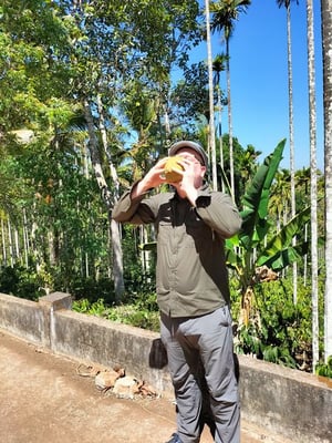 Seine Farm liegt traumhaft schön am Hang und bietet einen tollen Ausblick. Zur Begrüßung bekamen wir jeder eine frisch von der Palme geschlagene Kokosnuss. Nachdem wir die herrlich erfrischende