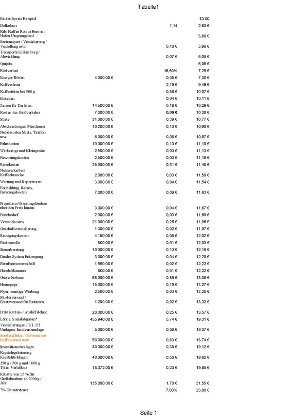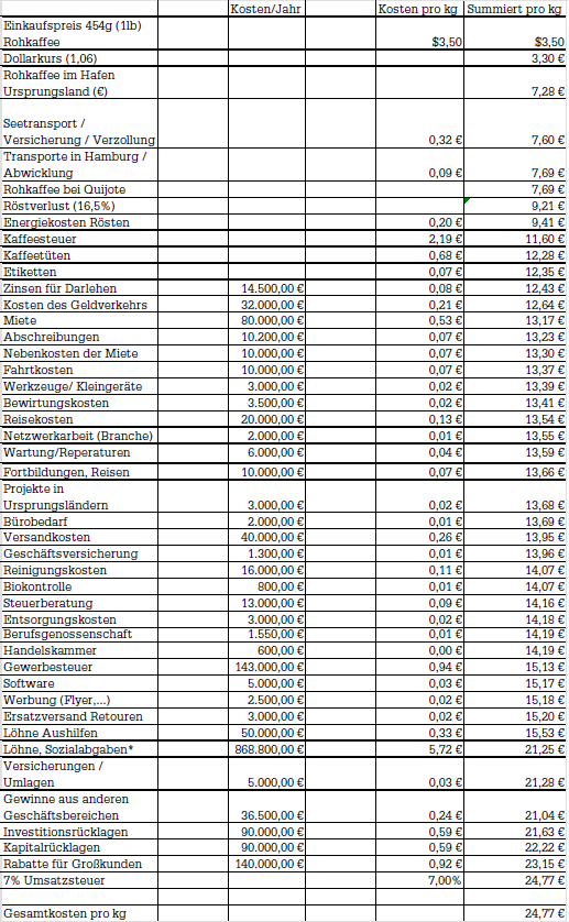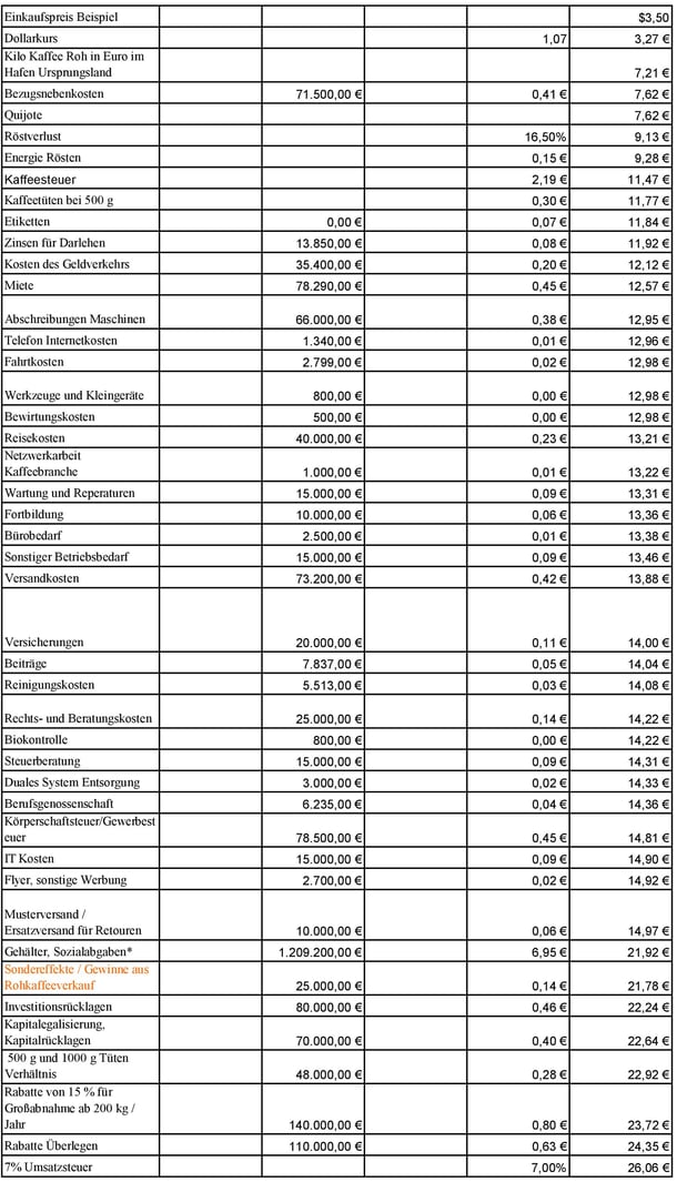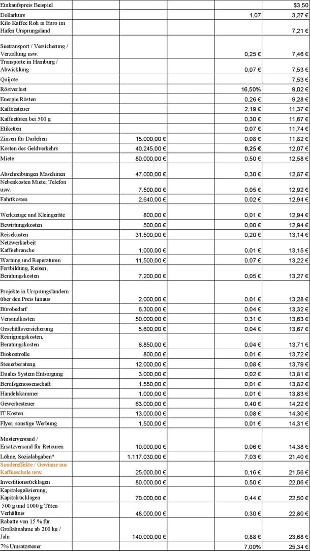 Hier veröffentlichen wir erneut eine sehr weit gehende Kalkulation eines unserer Kaffees. Sie basiert auf unseren momentanen Kosten und unserer für 2025 geplanten verkauften Kaffeemenge von 174.000 kg Röstkaffee. Sie wird kontinuierlich aktualisiert und bietet auch die Grundlage für unsere Planungen 2025.